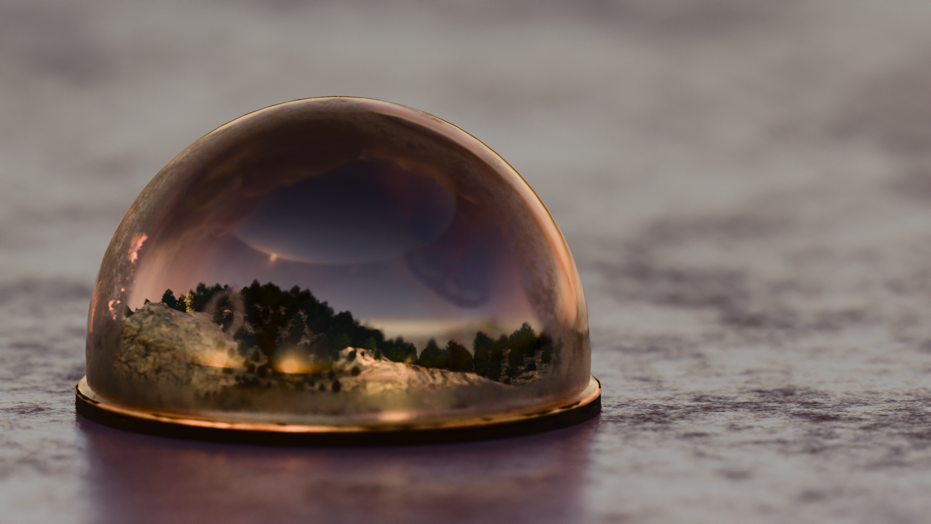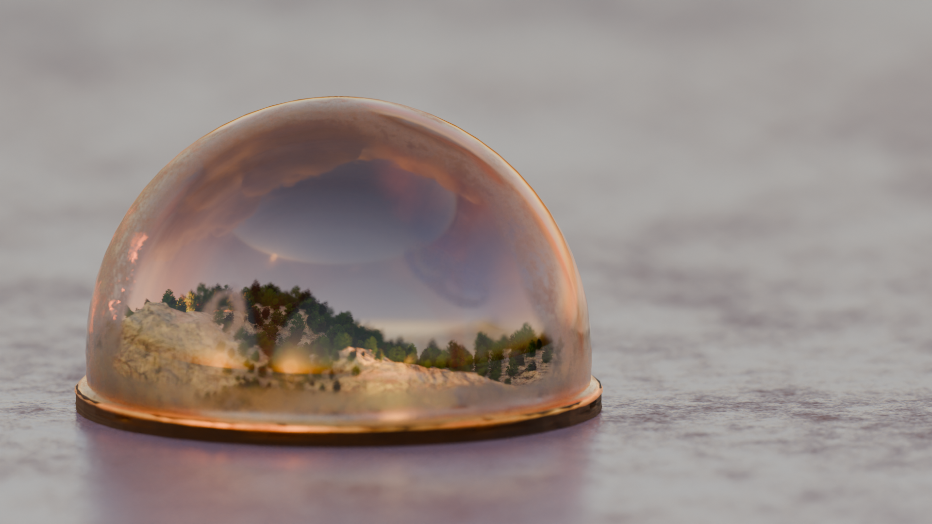 This snow globe contains a fragment of a snow-covered mountain, preserved beneath a thick glass dome set upon an aged metal base. Alpine terrain and vegetation remain suspended in a perfectly stable state.